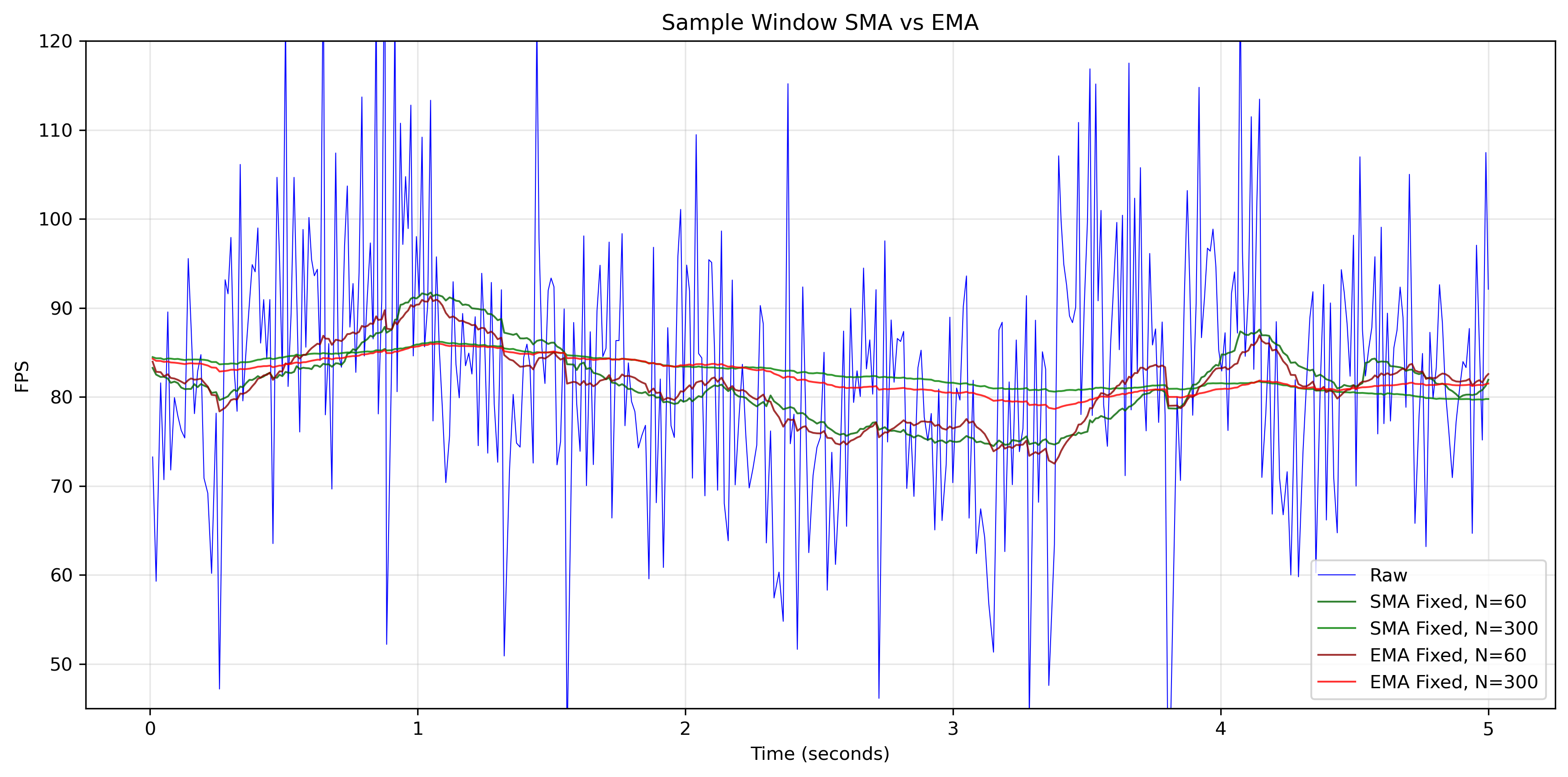 This can be used as is for a dirty and simple FPS counter if you just want the average over last n frames. More generally, this can be useful in other cases, like backend or embedded development, for whenever you need a low overhead moving average for metrics emitted by fixed frequency events. However, as discussed in the original post, the problem with using fixed sample averages for FPS is that it doesn’t properly depend on time. Especially when graphing the values over time, a slower framerate will look quite smooth, while a high framerate will be jittery.