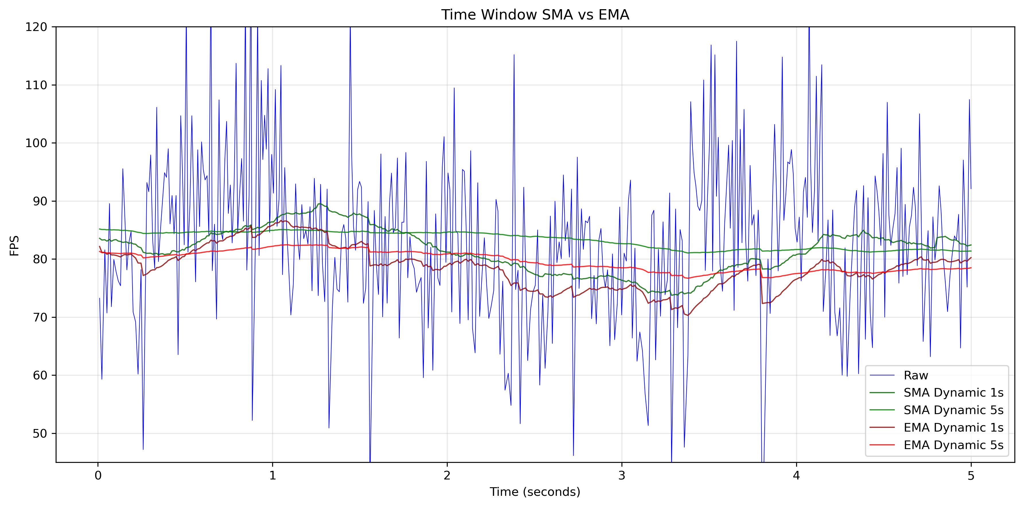I recently read an article about implementing FPS counters which covers a number of different methods, the benefits and drawbacks; though, it focuses exclusively on simple moving averages (SMA). I’m not a game developer, but I’ve done enough graphical programming that I’ve encountered this problem a number of times and instead gravitate toward using exponential moving average (EMA), which I haven’t seen discussed much for this use case.